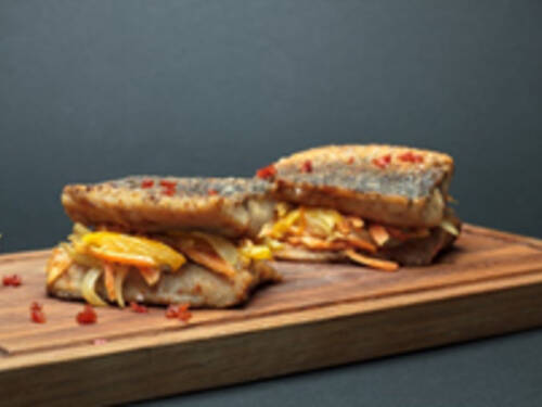 Пряный сибас, который считается рыбой премиум-класса, в лаваше с огурцом и зеленью.