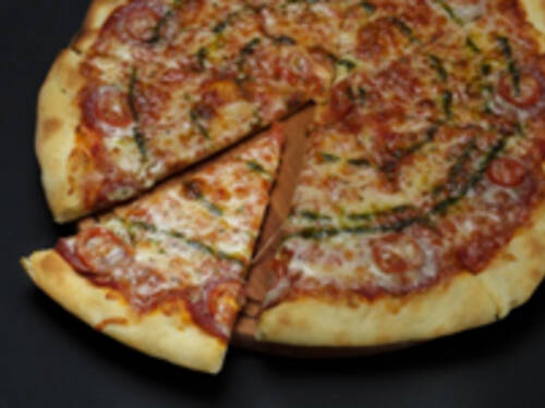 Пицца на тонком тесте с томатным соусом, салями, сыром и зеленью.